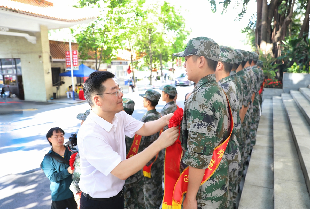 欢送仪式上,王兵、邓文新为入伍学生颁发纪念品、佩戴绶带和红花。王兵代表学校党委向光荣入伍的同学们表示热烈祝贺。他指出,今年正值中国人民抗日战争暨世界反法西斯战争胜利80周年,阅兵式上展现出的崇高精神,是每一位青年学子都应该深入学习、自觉传承的宝贵精神财富。